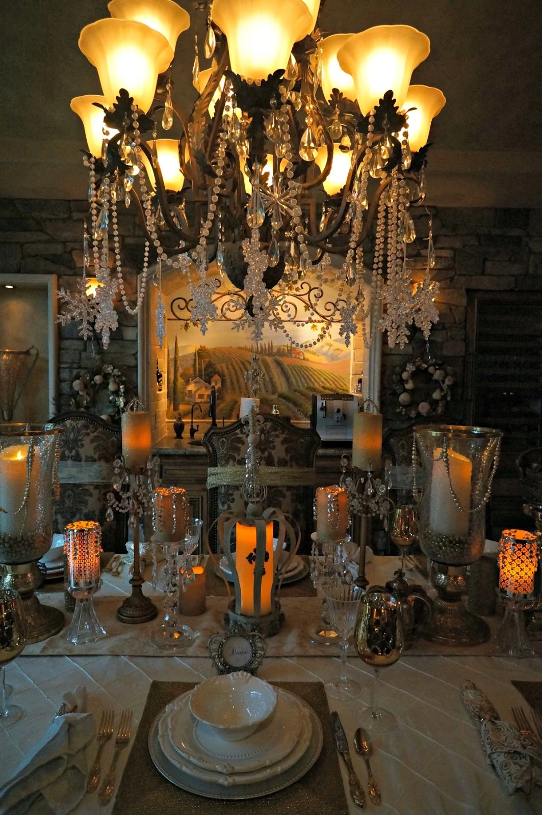 This is gorgeous Linda! Love all the beautiful details. I have those Luminara candles too and just love them. The beads on the chandelier really look dramatic- great job! The chairs look so pretty with the bows. Definitely fit for a king (and queen!)