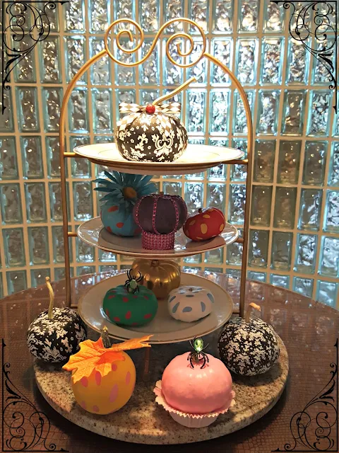 Agatha is one of my witches. She is a good witch. She is over seeing the black and white table. Spider web napkins are fan folded with a black spider napkin ring. Naturally my black and white damask balloon pumpkins sit on each plate.