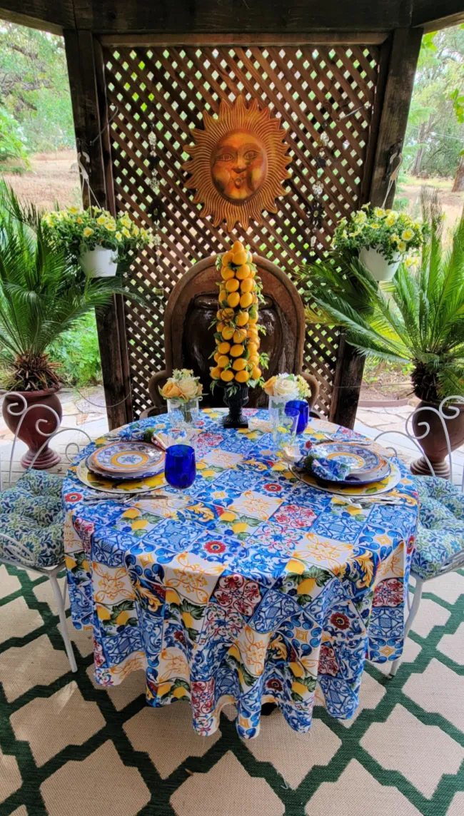 The plate stack is lemon cork placemats followed by a large cream, blue and yellow dinner plate and then topped with Le Cadeaux salad plates.