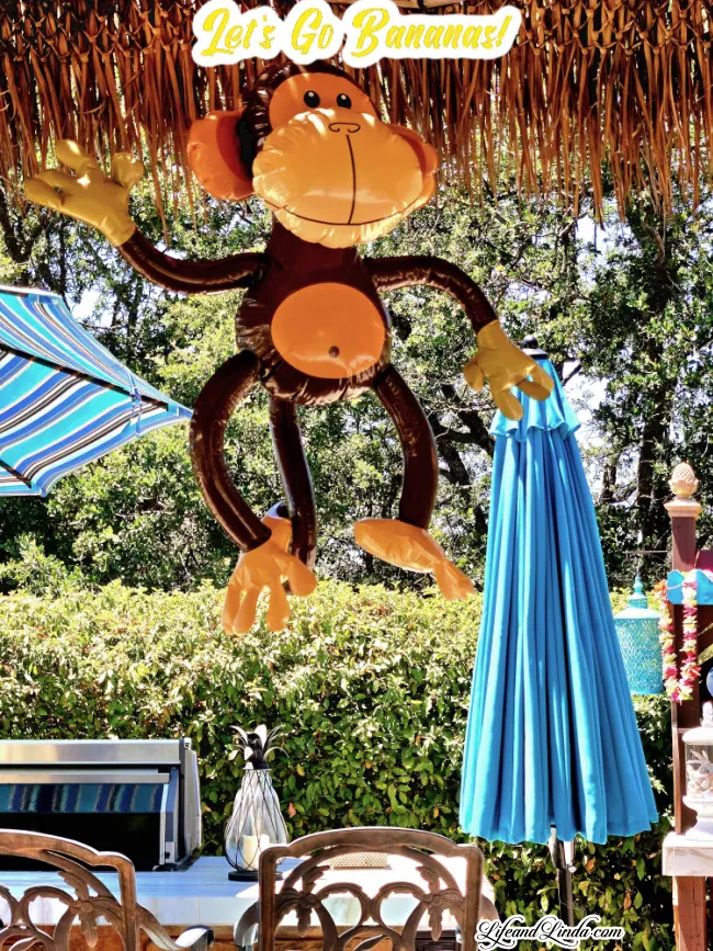 I hung monkeys all around the palapa and some sat on the table.  Large blow up monkey sat in a chair. Lots of monkeying around going on.